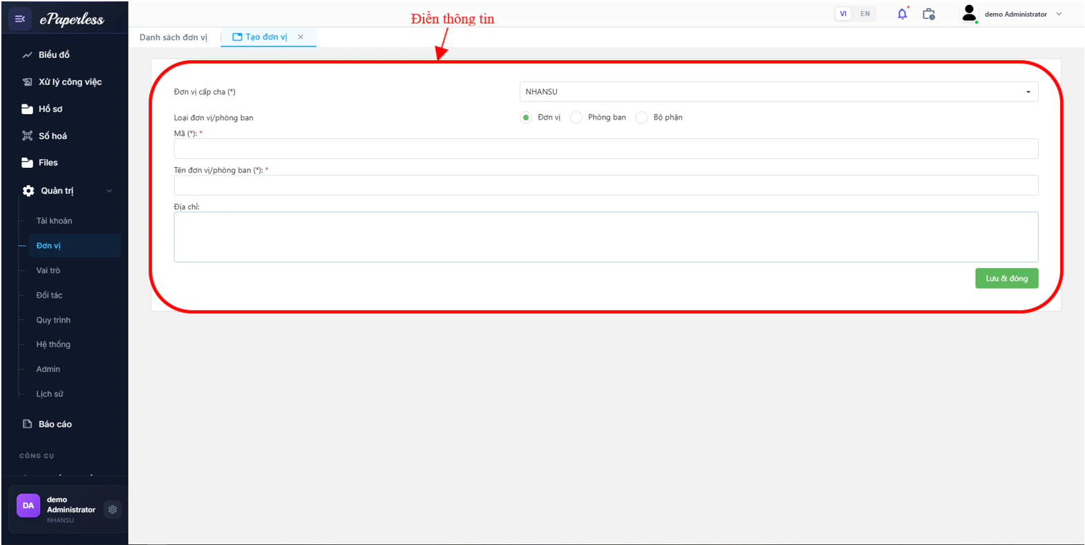 Tạo đơn vị/tổ chức mới trong hệ thống